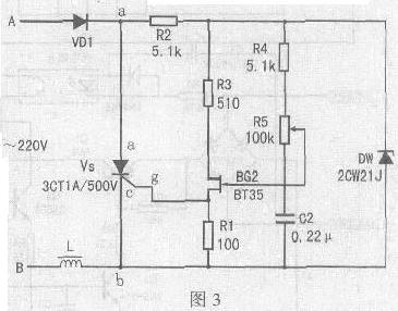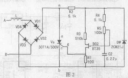 R3是作單結(jié)晶體管溫度補償之用,當R3增大時,溫度特性就要好一些,本電路也適用于可逆電機調(diào)速之用,負載端電壓調(diào)節(jié)范圍從35~215V連續(xù)可調(diào)。若負載為電機或電磁振動線圈,它不要求對轉(zhuǎn)矩進行補償,則電路可以進一步簡化,電路如圖2所示,其工作原理同圖1,輸出電壓主調(diào)節(jié)范圍是35~215V,R1的作用是保證VS輸出脈沖的幅度,R1增大,則輸出脈沖也增加,若作調(diào)光,則可將負載改作燈泡即可。