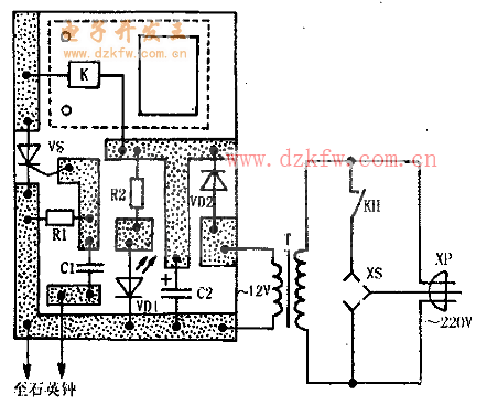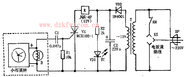 平時,單向晶閘管VS無觸發信號處于阻斷狀態,電磁繼電器K無電不吸合,其常開觸點KH斷開電飯煲電源,使電飯煲處于待煮飯狀態。當石英鐘按照主人事先設定好的時間發出鬧“鈴”時,由電磁訊,響器B輸出的電信號,經電容器C1耦合至單向晶閘管VS的控制端,直接觸發VS導通,使電磁繼電器K得電吸合,其常開觸點KH接通電飯煲電源,即實現電飯煲無人操作定時自動通電煮飯! ‰娐分,220V交流市電經電源變壓器T降壓、晶體二極管VD2半波整流和電容器C2濾波后,向控制電路提供約12V直流穩定工作電壓。限流電阻器R2和發光二極管VD1構成控制器通電指示燈電路。