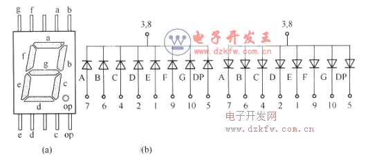 從圖4-4中可以看到,LED數碼管分共陰極和共陽極兩種接線方式,圖(a)所示為數碼管的外觀示意及各引腳功能,圖(b)所示為共陰極數碼管的等效電路,圖(c)所示為共陽極數碼管的等效電路。