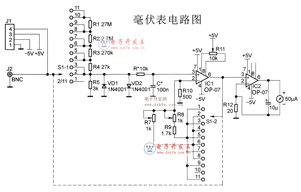 再有,整個電路,不能有非線性部分,大多數毫伏表,都會使用全波整流后在驅動表頭,整流電路是非線性元件,會引入偏差,因此這里直接用運放驅動表頭。
