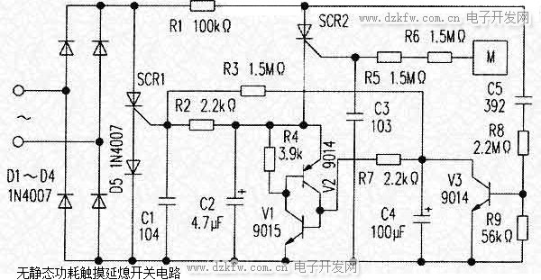 無靜態功耗觸摸延熄開關.電路如圖所示。由于在圖中的R8處,串聯了一個耐壓400V以上的小容量電容C5,平時沒有任何靜態電流。每次SCR1導通的時候,此小容量電容通過R1、R8、R9放電,延熄結束后,220V脈動直流電向此小容量電容快速充電。由于V1、V2導通時,C4上電壓只有0.6V左右,要把C4上不多的電荷放掉,對于電容C5只要幾千皮法即可,圖中C5為3900PF/500V。