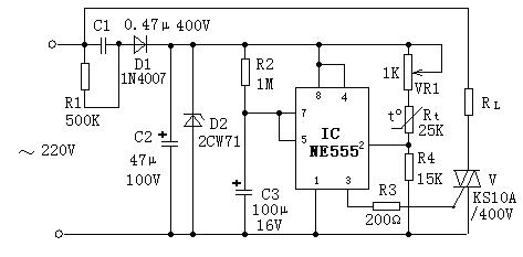 當溫度較低時,負溫度系數的熱敏電阻Rt 阻值較大,555 時基集成電路(IC)的2 腳電位低于Ec 電壓的1/3(約4V), IC 的3 腳輸出高電平,觸發雙向晶閘管V 導通,接通電加熱器RL 進行加熱,從而開始計時循環。當置于測溫點的熱敏電阻Rt 溫度高于設定值而計時循環還未完成時,加熱器RL 在定時周期結束后就被切斷。當熱敏電阻Rt 溫度降低至設定值以下時,會再次觸發雙向晶閘管V 導通,接通電加熱器RL 進行加熱。這樣就可達到溫度自動控制的目的。