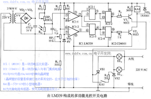 下圖是由電壓比較器LM339和CD4011構成的多功能光控開關電路,適用于工廠、學校、家庭等場所用來控制路燈等。