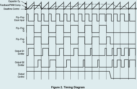 輸出脈沖的寬度是通過電容CT上的正極性鋸齒波電壓與另外兩個控制信號進行比較來實現。功率輸出管Q1和Q2受控于或非門。當雙穩觸發器的時鐘信號為低電平時才會被選通,即只有在鋸齒波電壓大于控制信號期間才會被選通。當控制信號增大,輸出脈沖的寬度將減小。參見圖2。