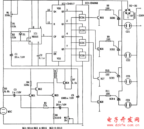 圖示參數的振蕩周期T在0.5~5秒范圍內變化。555的3腳輸出加至IC2作為CP脈沖。IC2采用CMOS型十進制計數器/脈沖分配器CD4017,在時鐘CP作用下,Q0(3腳)、Q1(2腳)、Q2(4腳)Q3(7腳)、Q4(10腳)相繼出現高電平脈沖,而Q4加至復位端R(15腳),使電路成為一環形計數電路。Q0~Q3的輸出依次將CD4066四模擬開關選通,使樂曲信號依次加至VT5、VT6、VT7、VT8,并依次導通,SCR1~SCR4依次觸發導通,彩燈插座依次有電,彩燈順序點亮,隨著悠揚的音樂,彩燈閃爍生輝。