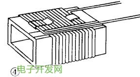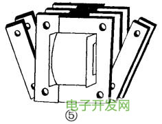 ( 3 )插硅鋼片。繞好線圈后取出木芯,可給繞組插入硅鋼片,一般把硅鋼片以兩片為一組,交替地插入線包內見圖 5 。當線包內將插滿硅鋼片時,余下的大約 1/6 硅鋼片往往比較難插入(俗稱緊片),這部分硅鋼片需用旋鑿撬開每兩片一組的硅鋼片夾縫才能插入,并用木錘輕輕敲入。插完硅鋼片的變壓器應放在平板上,兩頭用木錘敲打平整(尤其要注意硅鋼片“ E ”形與“ I ”形的對接處不能留有縫隙)。然后將硅鋼片夾緊、固定。在插片時,硅鋼片表面的絕緣層最好不要損傷。