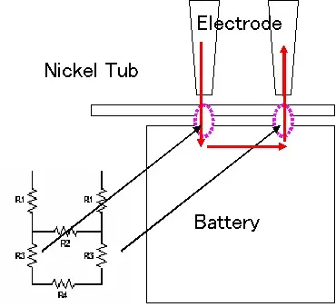 (圖片來(lái)源:Yokodai.JP Personal Spot Welder PRINCIPLE OF SPOT WELDING)圖中電流集中于兩個(gè)點(diǎn)處,所以局部會(huì)非常紅熱,加上外部壓接的壓力,金屬片就很容易的和電池電極融合,在相應(yīng)的部位形成焊點(diǎn):