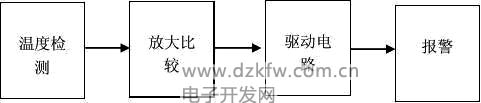 整個系統是由四步分組成,溫度的變化由溫度檢測電路呈遞給系統。若溫度超過預設值,溫度檢測電路將會把由溫度而引起的電壓改變反應給放大比較電路,該部分將微小電信號放大比較后啟動驅動電路,驅動電路的啟用將會使蜂鳴器控制部分工作,從而使蜂鳴器發聲。 2.2 設計方案