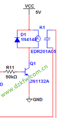 該部分電路中,三極管的基極輸入高電平時,使繼電器工作,常開的開關閉合,從而使下一級電路工作。