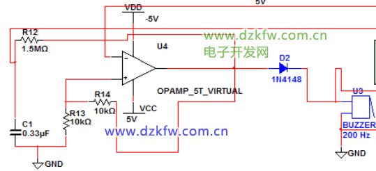 當外部溫度改變時會引起熱敏電阻阻值的改變而照成放大器兩輸入端電壓值改變,電壓的變化使放大電路正常工作,之后將放大后的電信號傳遞給比較器,使比較器產生相應的動作,從而啟用驅動電路,使方波發生電路工作,蜂鳴器發出間斷的鳴叫聲。