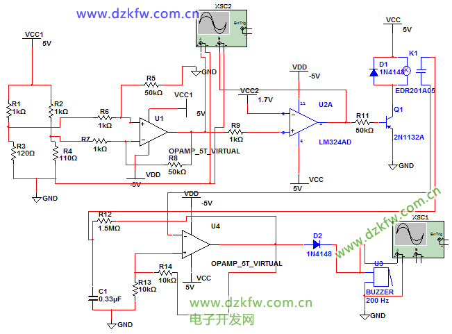 從實驗中,懂得了一個在設計中很重要的思想-單元模塊化,根據所需功能逐個設計電路,然而每個電路之間的聯系又是一個重點。本實驗中,可分為四個模塊,溫度檢測、信號的放大與比較、驅動電路、報警電路,當然各個電路之間的聯系又是關鍵,為整個系統的工作架上橋梁。在本設計中原本需加上濾波電路,但是所用電源比較穩定,所以沒有加濾波電路。