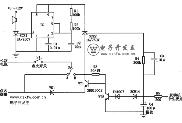 實用汽車防盜報警電路如圖所示。它主要由防盜部分和報警兩大部分電路組成。防盜電路:當汽車主人離開汽車時,將防盜開關S置于“B”位置,使汽車進入防盜狀態。當有竊賊進入駕駛室企圖發動汽車將其盜走時,只要擰動點火開關,汽車電瓶的 12V點火電流即經點火開關、防盜開關S及電阻R3,加到三極管VTl的基極,使VTl導通,從而有電流經二極管VDl加到點火線圈,發動機點火啟動。發動機工作時,其中性接點產生 6~ 8V的電壓。此電壓經電阻R5、穩壓二極管DW及二極管VD2加至三極管VT2的基極,VT2導通,從而迫使三極管VTl截止,點火電流中斷,發動機熄火。若再次啟動,將重復上述過程,從而使盜賊無法將車發動開走。當汽車主人欲使用車輛時,只要將防盜開關S置于“A”位置,即可解除防盜警戒,汽車可正常啟動行駛。報警電路:其主要由單向晶閘管SCRl、SCR2及NE555時基集成電路組成,報警器喇叭是借助汽車喇叭發聲,既清脆又響亮。時基集成電路NE555接成自激多諧振蕩器。當晶閘管SCR2一旦被觸發導通,即接通了報警電路電源。在電源接通時,由于電容C2尚來不及充電,故NE555的②腳處于低電平,則此時自激多諧振蕩器③腳輸出高電平信號,從而觸發SCRl導通,汽車喇叭發聲。隨后電源經電阻Rl、R2向電容C2充電。其充電電壓達到2/3電源電壓時,NE555的③腳又變為低電平,SCRl在汽車喇叭自身振動膜片的作用下,因控制極無觸發電壓而關斷,喇叭停止發聲。當C2上的充電電壓經NE555內部的放電管放電到1/3電源電壓時,NE555的③腳又輸出高電平,再次觸發SCRl導通,喇叭再次發聲。電容C2再次充電,如此周而復始,形成振蕩,使汽車喇叭發出斷續的報警響聲。改變電阻R2的阻值,可改變報警聲響的頻率。當電路處于防盜報警狀態時(防盜開關S置于“B”位置),盜賊一旦打開點火開關,晶閘管SCR2的陽極即加有 12V電壓。發動機啟動后,其中性接點輸出的電壓,經R4、C3組成的微分電路送至SCR2的控制極,將SCR2觸發導通,為報警電路集成NE555提供工作電源,使汽車喇叭發出報警響聲。靜態時整個電路的功耗很低。