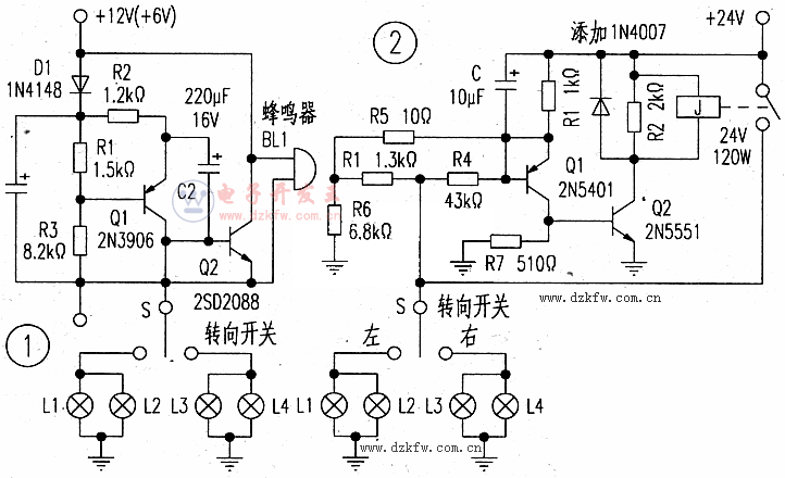 這兩款閃光器的Q2都易損壞,建議用TIP41C(100V,6A、65w)等中功率管代換。圖2中的繼電器也容易損壞(一般是觸點燒蝕,打磨后還可使用)。為了保護Q2不被繼電器線圈的感應電動勢擊穿,可以按圖中所示加一只二極管。