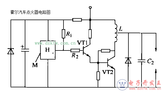 這種新型點火器以其耗油少、事故事低、產出功率大等優點吸引著汽車生產廠家和用戶。其工作原理如圖所示,當汽車氣缸中的活塞運行到達上死點時,分電器中有一磁場作用于霍爾電路,輸出低電平。這時,原來流經電阻Ri、島的電流改變方向,流人霍爾電路H,故晶體管VT1、VT2截止。儲存于L中的磁能就在L、G電路中振蕩起來,形成200V以上的交變電壓。此電壓經點火線圈升壓后,產生15kV的高壓,點燃氣缸中的燃油。隨著發動機旋轉,上述過程周而復始,通過霍爾傳感器檢測位置達到自動控制的目的。