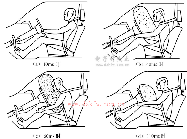 汽車(chē)撞車(chē),達(dá)到氣囊系統(tǒng)引爆極限,傳感器從測(cè)出碰撞到接通電流需10 ms,引爆器點(diǎn)燃?xì)饽业臍怏w發(fā)生器,而此時(shí)駕駛員仍然處于直坐狀態(tài)。