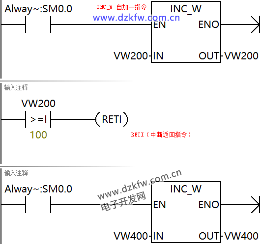 (5)S7-200SMART中最多使用128個中斷程序,新建工程中默認有一個中斷程序,中斷程序不能嵌套。(6)中斷程序應短小而簡單,執行時對其他處理不要延時過長,即越短越好。