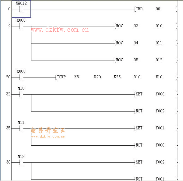這里運用到了傳送指令MOV,當X0為ON,把時間數(shù)據(jù)時D3分D4秒D5傳送到D10,D11和D12;應用TCMP對設定時間K8 ,K20 K25,即八點二十分,二十五秒,進行比較,將比較結果用M10,進行輸出.比較結果當當前時間小于設定時間,M10為ON,把Y0置位,同時把Y2復位;當當前時間等于設定時間,M11狀態(tài)為ON, 把Y1 置位,同時把Y0 復位;當當前時間大于設定時間,M12狀態(tài)為ON,置位 Y2 ,把Y1 復位。
