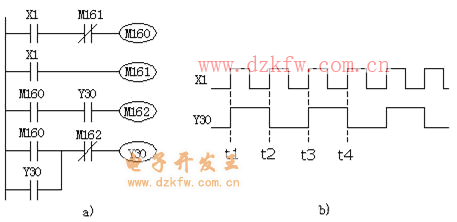 圖中,Y30產(chǎn)生的脈沖信號是X1脈沖信號的二分頻。圖1b中用了三個輔助繼電器M160、M161和M162。當(dāng)輸入X1在t1時刻接通(ON),M160產(chǎn)生脈寬為一個掃描周期的單脈沖,Y30線圈在此之前并未得電,其對應(yīng)的常開觸點處于斷開狀態(tài),因此執(zhí)行至第3行程序時,盡管M160得電,但M162仍不得電,M162的常閉觸點處于閉合狀態(tài)。執(zhí)行至第4行,Y30得電(ON)并自鎖。此后,多次循環(huán)掃描執(zhí)行這部分程序,但由于M160僅接通一個掃描周期,M162不可能得電。由于Y30已接通,對應(yīng)的常開觸點閉合,為M162的得電做好了準(zhǔn)備。