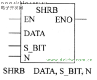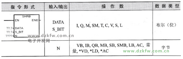移位寄存器位( SHRB)指令將DATA數值移入移位寄存器。S_BIT指定移位寄存器的最低位。N指定移位寄存器的長度和移位方向(當N是正的,從低位移到高位,當N是負數,就從高位移到低位)。SHRB指令移出的每個位被放置在溢出內存位(SM1.1)中。該指令由最低位(S_BIT)和長度(N)指定的位數定義。