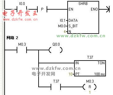 下面就分析一下程序,檢測裝置檢測到有產品時I0.0為1,I0.1檢測產品的好壞,產品壞為1,指定移位寄存器的最低位為M0.0,移位寄存器的長度為4。因為在第4個產品位置有一個氣缸Q0.0,若I0.1為1時,到達第4個產品位置時,那么就用M0.3驅動氣缸動作,推出產品,同時做了一個定時器定時1s,1s后復位M0.3,氣缸退回。