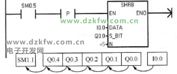 移位寄存器指令影響的特殊繼電器:SM1.0(零),SM1.1(溢出)。當移位操作結果為0時,SM1.0自動置位;SM1.1的狀態由每次移出位的狀態決定。