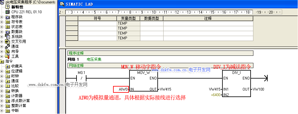 思路2:將采集到的電壓數字量值(0~32000,在寄存器AIW0中)發送給寄存器VW415,該數字量值除以6400就是采集到的電壓值(0~5v對應0~32000),再送給寄存器VW100。上位機程序讀取PLC寄存器VW100中的值就是電壓實際值。PLC程序如圖2 所示。