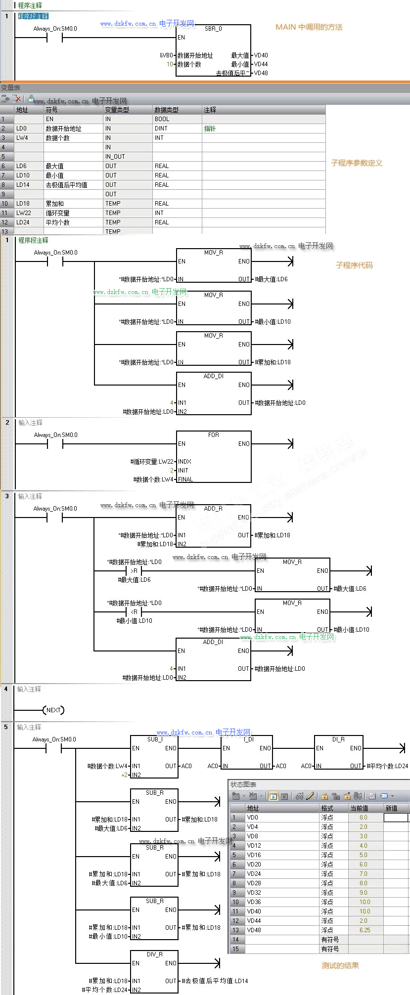 在主程序中調用后,子程序實現計算 VD0-VD36 共 10 個浮點數的和,減去最大值、最小值后剩下的8個數的平均值,程序經過了測試,注意程序中使用 * & 這樣的間接尋址的操作符號。