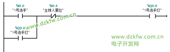 如圖,只有當(dāng)2號選手、3號選手、4號選手都沒有搶答的時候,1號選手才能點(diǎn)亮自己的燈;如果有一個人搶答,例如4號選手,那么當(dāng)4號選手燈點(diǎn)亮后,其常閉觸點(diǎn)斷開,能流永遠(yuǎn)無法通過,直至主持人開啟新一輪搶答。其他只有當(dāng)2號選手、3號選手、4號選手可以參考1號選手的梯形圖程序進(jìn)行編寫,就可以得出一個四路搶答器的梯形圖程序。