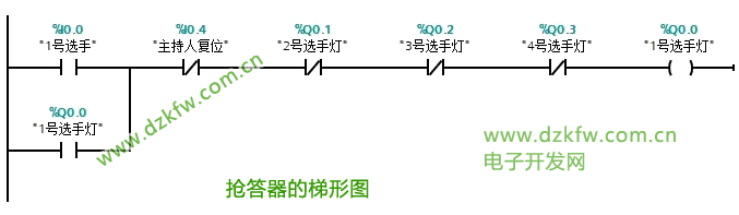 這個搶答器的題目很經(jīng)典,其實(shí)就是自鎖和互鎖的應(yīng)用首先是選手搶答,對于選手來說,他按下按鍵,就應(yīng)該亮起他的燈當(dāng)他松手的時候,燈應(yīng)該保持亮著那么就是一個按鍵自鎖