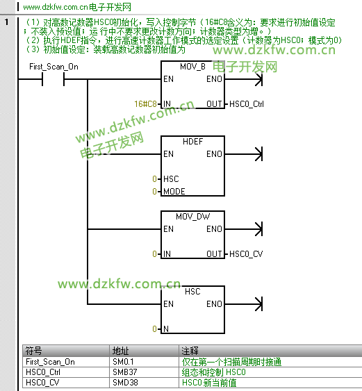 上述程序注解:(1)對高數(shù)記數(shù)器HSC0初始化,寫入控制字節(jié)(16#C8含義為:要求進(jìn)行初始值設(shè)定;不裝入預(yù)設(shè)值;運 行中不要求更改計數(shù)方向;計數(shù)器類型為增。)