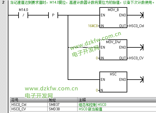 上述程序注解:當(dāng)記速值達(dá)到要求值時,M14.0復(fù)位,高速計數(shù)器計數(shù)將復(fù)位為初始值,以備下次計數(shù)使用。