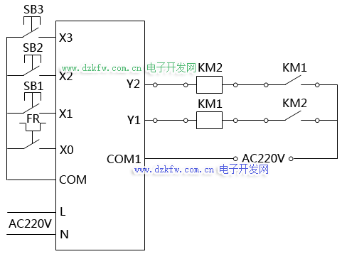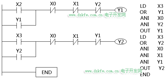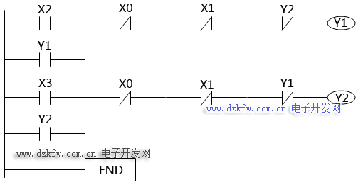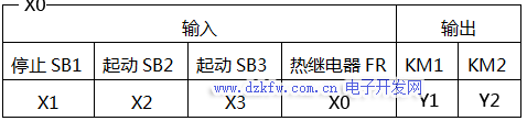 停止按鈕SB1,信號從X1輸入;啟動按鈕SB2和SB3,信號從X2、X3輸入;熱繼電器FR的信號從X0輸入;KM1、KM2為接觸器線圈,對應于PLC內部編程元件為Y1、Y2,信號從Y1、Y2端輸出。