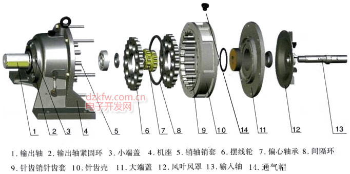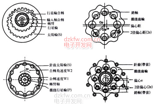 在輸入軸上裝有一個錯位180°的雙偏心套,在偏心套上裝有兩個稱為轉(zhuǎn)臂的滾柱軸承,形成H機(jī)構(gòu)、兩個擺線輪的中心孔即為偏心套上轉(zhuǎn)臂軸承的滾道,并由擺線輪與針齒輪上一組環(huán)形排列的針齒相嚙合,以組成齒差為一齒的內(nèi)嚙合減速機(jī)構(gòu),(為了減小摩擦,在速比小的減速機(jī)中,針齒上帶有針齒套)。