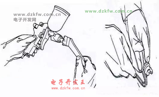 3)用一塊擦拭布將噴嘴堵住,扣動扳機,利用壓縮空氣逆向沖洗噴槍。