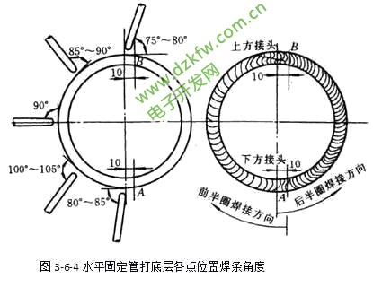 (2)斷弧焊引弧在時鐘6-5點位置,即仰焊位置引弧,用長弧進(jìn)行預(yù)熱,當(dāng)焊條端部出現(xiàn)熔化狀態(tài)時,用腕力將焊條端部的第一、第二滴熔滴甩掉。與此同時,觀察預(yù)熱處有“出汗”現(xiàn)象時,迅速而準(zhǔn)確地將焊條熔滴送入始焊端間隙,稍做一下左右擺動的同時,焊條向后上方稍微推一下,然后向斜下方帶弧、滅弧,第一個熔池就這樣形成了,引弧工作結(jié)束。(3)焊條角度1)起焊點,即時鐘5-6點位,焊條與焊接方向管切線的夾角為80-85°。2)在時鐘7-8點位置為仰焊爬坡焊,焊條與焊接方向管切線的夾角為100°-105°。3)在立焊位置,即時鐘9點鐘位置,焊條與焊接方向管切線的夾角為90°。4)在立位爬坡焊位置,即時鐘10-11點位置施焊過程中,焊條與焊接方向管切線的夾角為85-90°。5)在平焊位置,即時鐘12點位置焊接時,焊條與焊接方向管切線的夾角為75-80°。各點位置焊條角度如圖3-6-4及3-6-5所示。前半圈與后半圈相對應(yīng)的焊接位置,焊條角度相同。