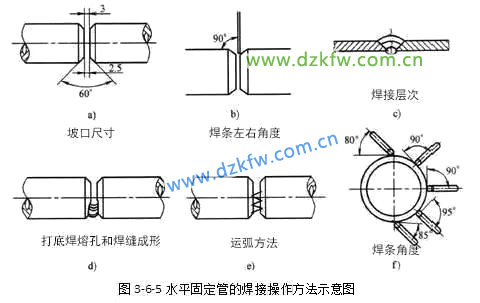 (1)仰焊位置,即時鐘6-7點位置,焊條與焊接方向管切線的夾角為85°-90°。(2)仰位爬坡焊位置,即時鐘7-8點位置,焊條與焊接方向管切線的夾角為105°-110°。(3)立焊位置,即時鐘9點鐘位置,焊條與焊接方向管切線的夾角為95°。(4)立位爬坡焊位置,即時鐘10-11點位置,焊條與焊接方向管切線的夾角為90°-95°。(5)平焊位置,即12點鐘位置,焊條與焊接方向管切線的夾角為75°-80°