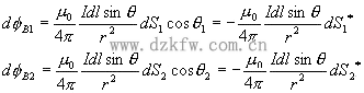 在磁感應線穿入處取一面元dS1,穿出處取另一面元dS2,IdL產生的磁場通過兩面元的磁感應通量分別為: