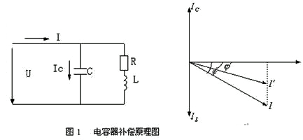 電力系統中的負載大部分是感性的,因此總電流將滯后電壓一個角度,如圖1所示,將并聯電容器與負載并聯,則電容器的電流將抵消一部分電感電流,從而使總電流減小,功率因數將提高。