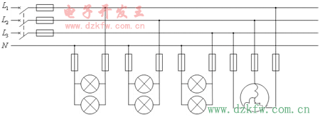額定電壓220V的負載連接在三相四線制電路中,應接在相線與中性線之間。由于此種負載大量使用,所以不能集中接在一相中。從總的線路來看,負載應均勻分配在各相中,構成負載的星形連接。比如,電燈與電動機在三相電路中的星形連接如下圖所示。