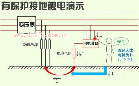 (1)保護接地:電氣設備的導體部分或者外殼用足夠容量的金屬導線或導體可靠的與大地連接,當人體觸及帶電外殼時,人體相當于接地電阻的一條并聯支路,由于人體電阻遠遠大于接地電阻,所以通過人體的電流將會很小,避免了人身觸電事故。