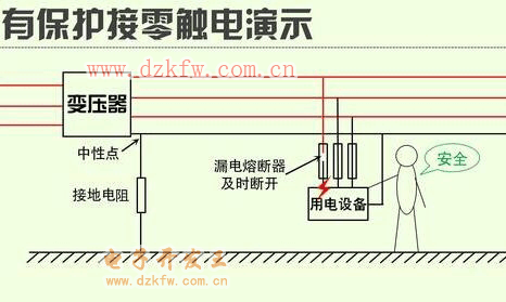 (2)保護接零:適用于中性點接地的三相電源系統中(一些民用三相四線中性點接地系統也采用保護接地,但必須是配合帶有漏電保護的開關使用)。