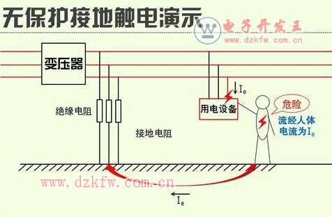 (1)在中性點不接地系統中:當人體觸及電氣設備的導體部分或者外殼時,人體相當于一個與接地電阻并聯支路的一個大電阻。若按人體電阻值1000Ω(通常人體電阻值為1000~2000Ω)計算,設備外殼所帶電壓為220V時,那么無保護接地時流經人體的電流為:Ir=220/Rr=220mA(人體可以承受的最大交流電流/交流擺脫電流為10mA)。