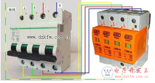 三相四線制漏電保護器和浪涌保護器實物接線圖