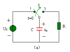 電路換路之前開關(guān) S 處于位置 1 ,直流電壓源 Us 對(duì)電容 C 充電,電路已處于穩(wěn)定狀態(tài),換路前的等效電路如圖 5.3-1 ( b )所示。