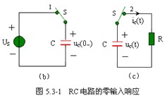 圖 5.3-1 電路中,電路換路之前電容處于充電狀態(tài),電容從電壓源吸收能量并儲(chǔ)存起來(lái),電路換路之后,電容又開始放電,釋放的能量被電阻 R 所消耗,零輸入響應(yīng)就是一個(gè)放電的過(guò)程。