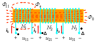 圖1所示的耦合電感中,兩兩同名端用相同的符號表示,如 *、△、·。通過同名端的確定,得到