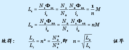 即在全耦合(K=1)時,兩線圈的電感之比,是等于其匝數平方之比,亦即每個線圈的電感都是與自己線圈匝數的平方成正比。