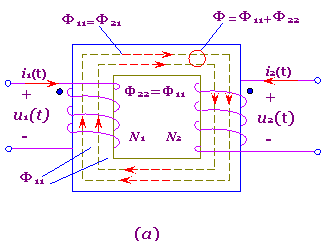 從圖7-6-1(a)看出,由于無漏磁通,故穿過兩個線圈的總磁通相同,均為Φ=Φ21+Φ12=Φ11+Φ22。又由于圖中u1(t),i1(t)和Φ三者的參考方向互為關聯,u2(t),i2(t)和Φ三者的參考方向也互為關聯,故: