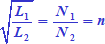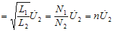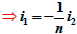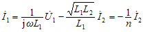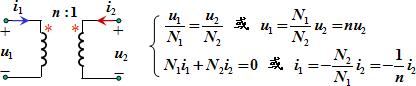 注意上式是根據圖中的參考方向和同名端列出的。式中n=N1/N2, 稱為理想變壓器的變比。