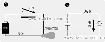 1號實物電路圖中,檔開關閉合傷后,電路中就有電流流過,電能的來源是由電池將化學能轉換而來,燈泡作為負載將電池中通過導線傳輸過來的電能轉換成熱能消耗掉,這個過程實現了電能與熱能、光能的轉換。當開關斷開后電路便切斷,電流無法流通,燈泡失去了電能能量就不能發光了。2號圖則是為了設計和分析而把電路中實物簡化用符號表示,通常稱為電路圖。